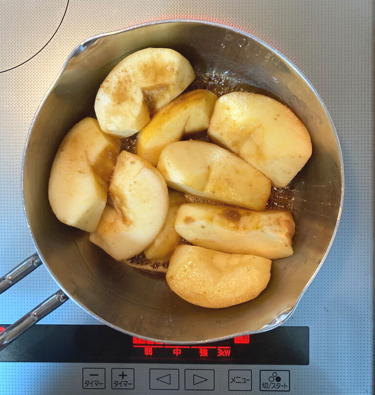 ブラウンシュガーでりんごを煮ます。